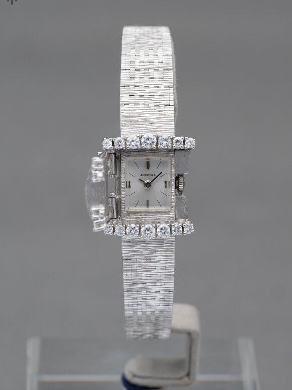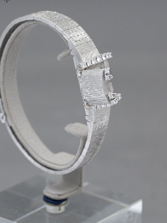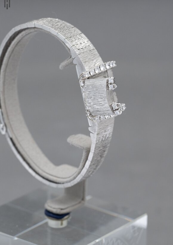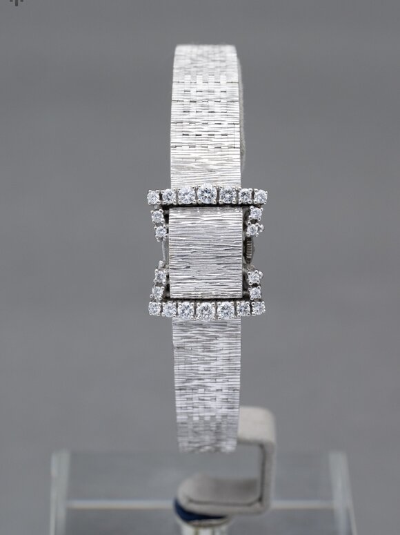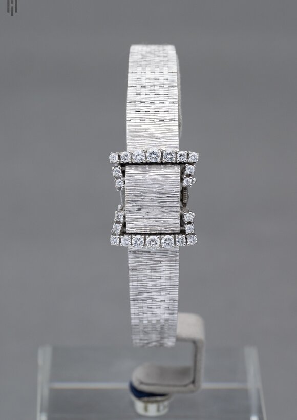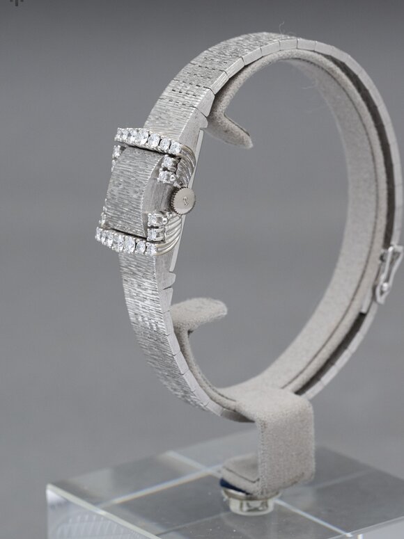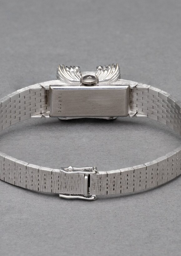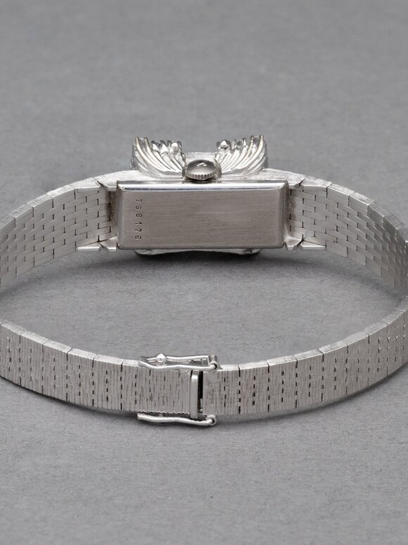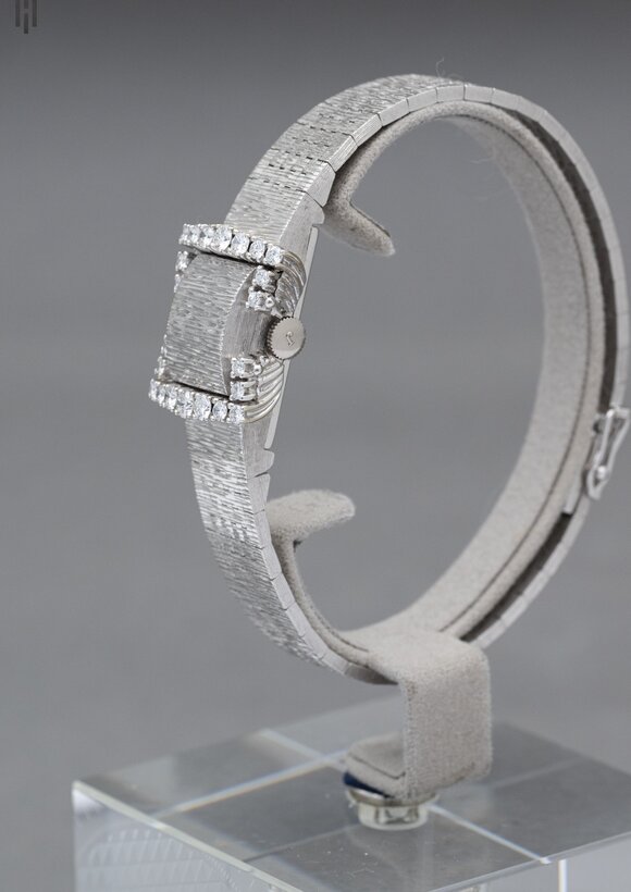 Ein wunderbarer Ausdruck der verspielten 1960er Jahre findet sich in dieser Schmuckuhr wieder. Das feingliedrig gearbeitete und strukturierte Armband und die von der Seite floral anmutenden Diamantfassungen zeigen die Handwerkskunst dieser Damenuhr. Der an zwei Scharnieren befestigte Deckel, welcher erst nach dem vorsichtigen öffnen den Blick auf das Zifferblatt freigibt, zeugen von der Fantasie und der Verspieltheit des Schöpfers. Mehr als ein Schmuckstück und mehr als nur eine Uhr für die Dame mit Stil. Für besondere Momente auf welche man sich freut und für immer in Erinnerung behält.